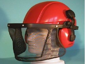 Waldarbeiter-Schutzhelm-Kombination bestehend aus Schutzhelm, Gesichtschutzgitter und Kapselgehörschutz.Forestry helmet consisting of safety helmet, mesh visor screen and ear-defender